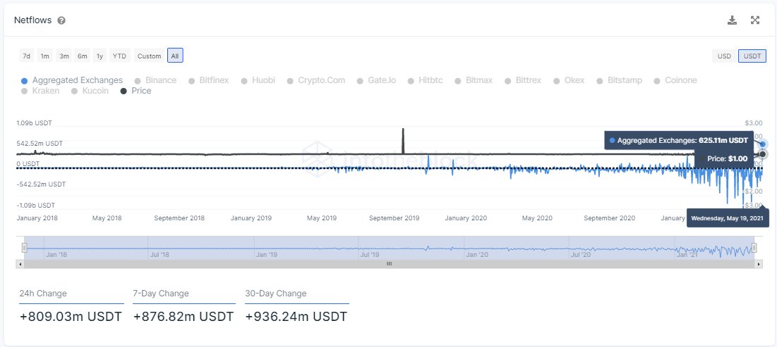 В отчете IntoTheBlock говорится, что 19 мая на торговые площадки были переведены USDT на общую сумму до $625,1 млн.