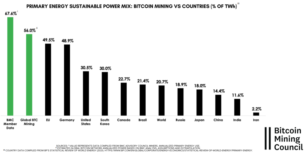 BMC входят 23 компании, на которые приходится 32% хешрейта сети первой криптовалюты. Согласно опросу среди участников объединения, доля возобновляемой энергии в их деятельности составила 67,6%.