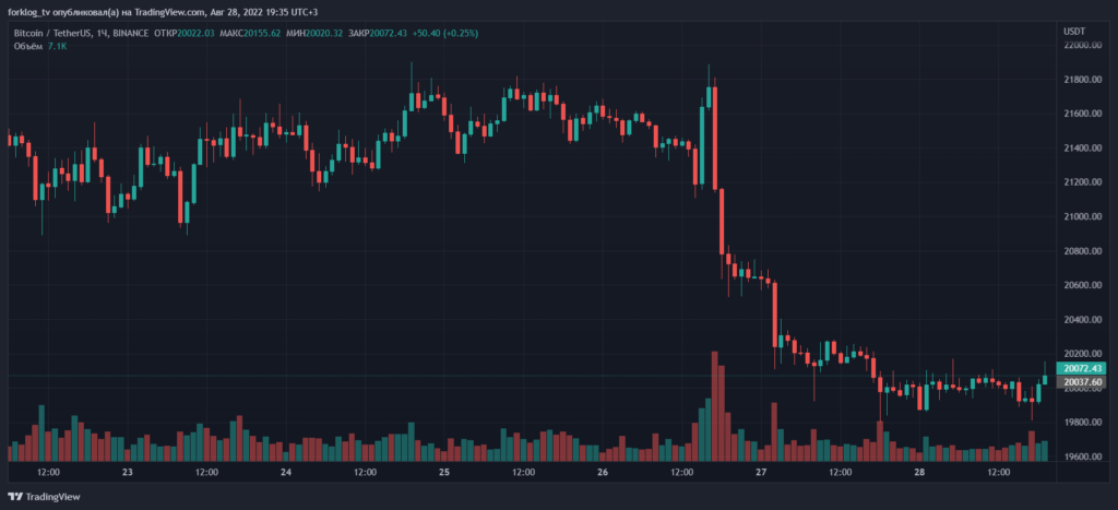 26 августа глава ФРС Джером Пауэлл заявил, что для контроля над инфляцией центробанку необходимо будет какое-то время удерживать процентные ставки на высоком уровне. Биткоин отреагировал на выступление чиновника падением ниже $21 000, а затем провалил уровень $20 000.