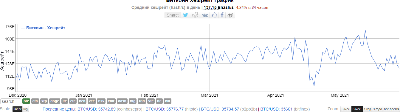 Хешрейт биткоина в конце прошлой недели держался в районе 150 экзахеш в секунду (EH/s). 30 мая вычислительные мощности упали до 121 EH/s, об этом свидетельствуют данные BitinfoCharts.