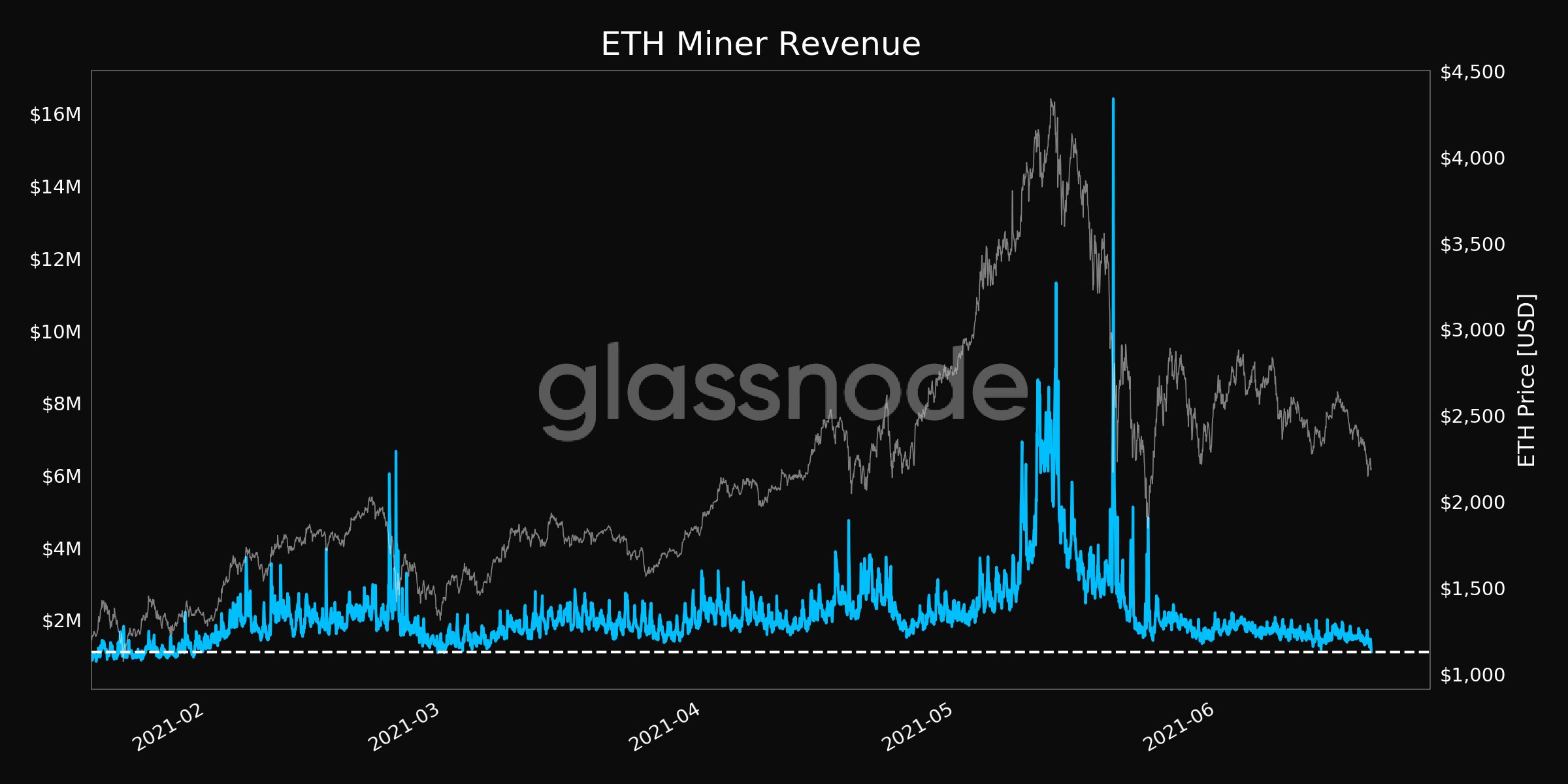 Кроме этого, аналитики обратили внимание на падение доходов эфириум-майнеров. По данным той же команды Glassnode, выручка майнинг-пулов, добывающих эфир, сейчас находится на трехмесячном минимуме ($1,121 млн).