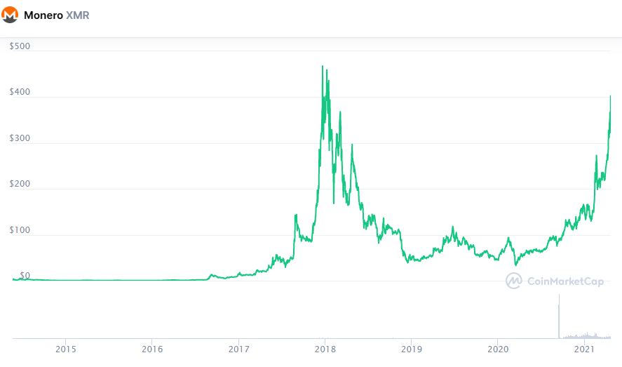 В ночь на среду, 21 апреля, курс XMR достиг $400. Последний раз на таком уровне альткоин находился в середине января 2018 года. За минувшие сутки капитализация Monero прибавила почти 15%, и сейчас она превышает $7,063 млрд.