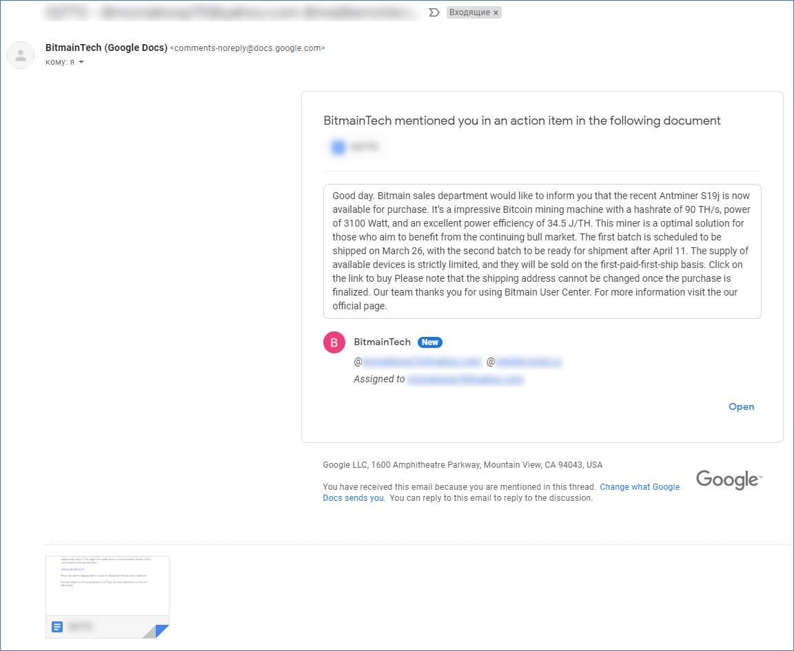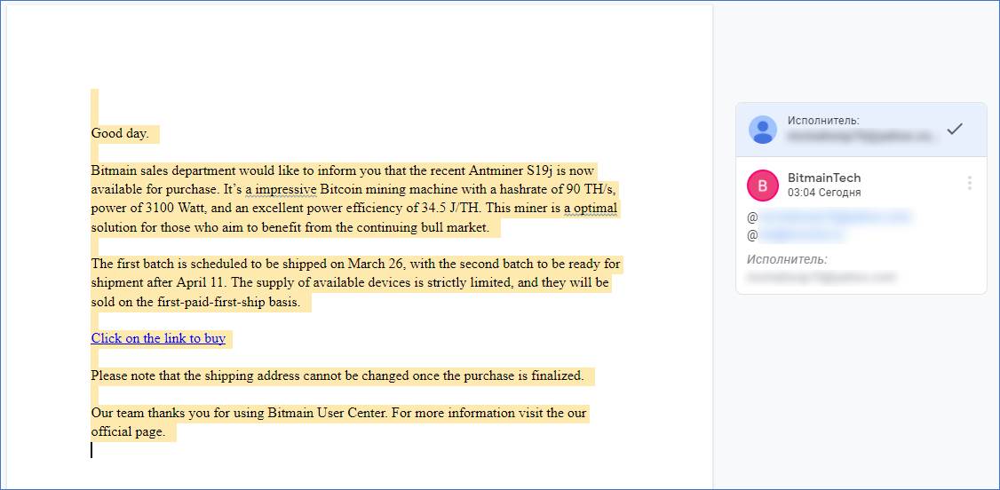 сообщили эксперты «Лаборатории Касперского». Злоумышленники отправляют потенциальным жертвам электронные письма, в которых сообщают, что они якобы упоминаются в файле Google Docs пользователем под псевдонимом BitmainTech. Выдавая себя за сотрудников отдела продаж, мошенники объявляют о старте ограниченного предзаказа на оборудование Antminer S19j. [caption id="attachment_132475" align="alignnone" width="1152"]