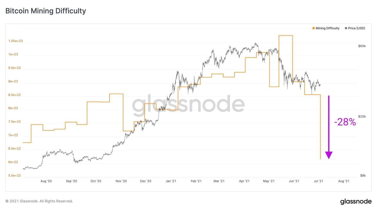 По данным Glassnode, сложность майнинга BTC упала на 28%. Аналитики напоминают, что данный показатель отражает возможности майнеров по добыче блока.