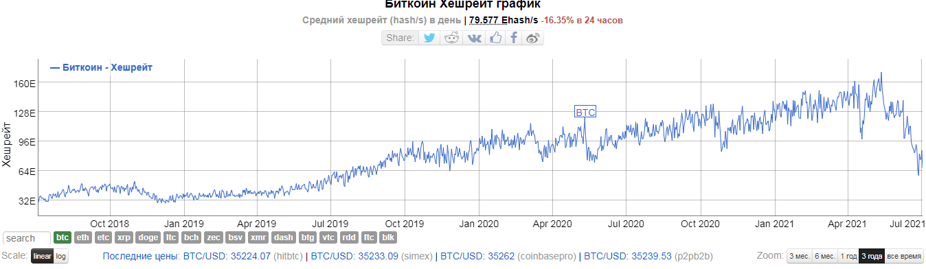 Хешрейт сети на этой неделе также демонстрирует рекордное падение. По данным BitinfoCharts, данный показатель сейчас находится на самом низком уровне с августа 2019 года, он составляет 65,87 экзахеш в секунду (EH/s).