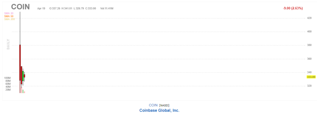 По итогам торгов 19 апреля, котировки акций Coinbase Global завершили сессию на отметке $333 с понижением на 2,63%. 14 апреля цена открытия составила $381.