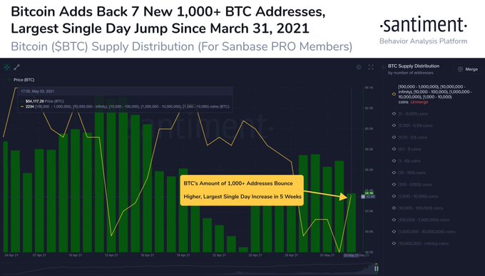 Аналитики подчеркнули, что 3 мая произошел самых большой прирост числа "китовых" адресов, содержащих не менее тысячи биткоинов. Последний раз похожий всплеск активности наблюдался в конце марта.
