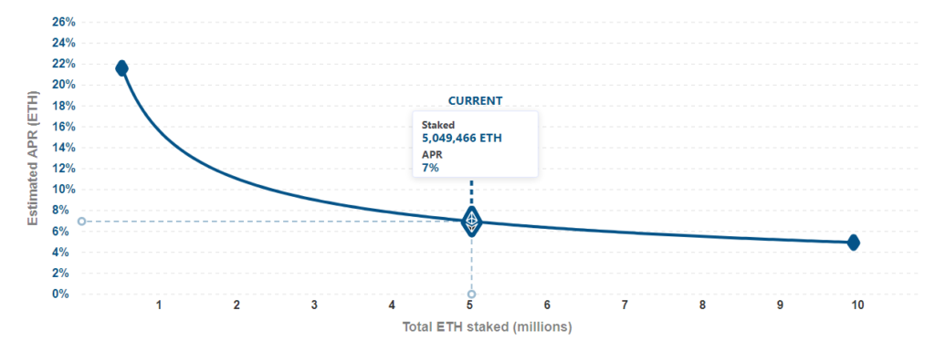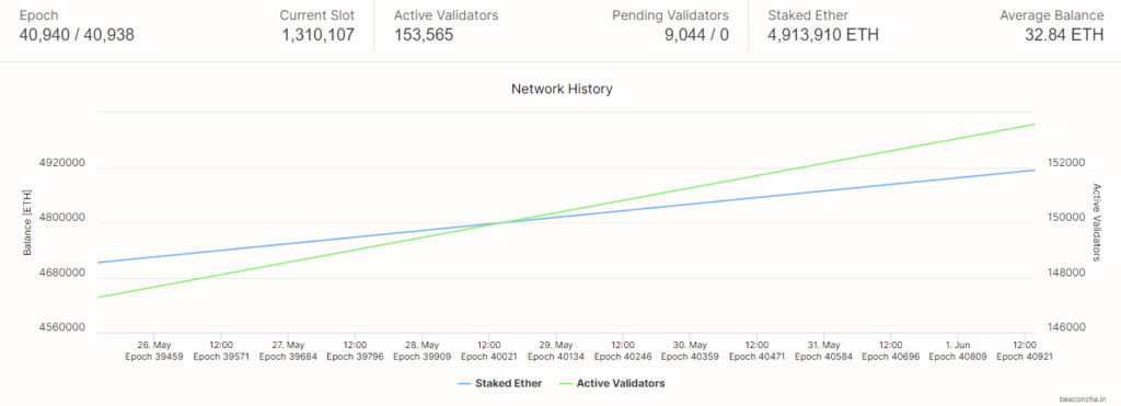 По информации beaconcha.in, в экосистеме Ethereum 2.0 работает 153 549 валидаторов. В стейкинге находится 4,9 млн ETH (в среднем 32,83 ETH на каждом адресе).