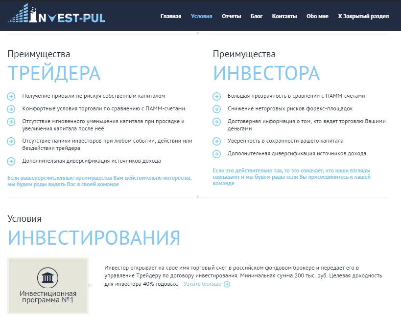 1. Инвестор открывает на своё имя торговый счёт в российском фондовом брокере и передаёт его в управление Трейдеру по договору инвестирования. Минимальная сумма 200 тыс. руб. Целевая доходность для инвестора 40% годовых.