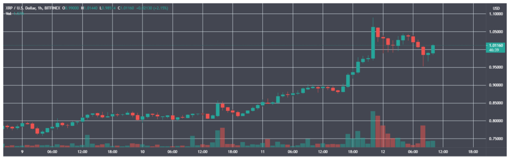 На фоне новости о новом партнерстве цена токена XRP от Ripple выросла более чем на 25%. С уровней в районе $0,85 актив в моменте подорожал до $1,08 (Bitfinex)