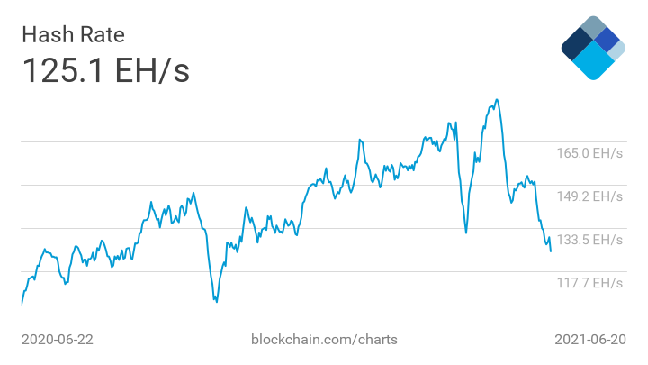 Параллельно наблюдается снижение вычислительных мощностей в сети биткоина Сегодня данный показатель обновил минимум. Хешрейт BTC 21 июня упал до 125 экзахеш в секунду (EH/s) - это самое низкое значение с ноября прошлого года. Пиковая активность биткоин-майнеров наблюдалась в середине мая, тогда хешрейт превышал 170 EH/s.