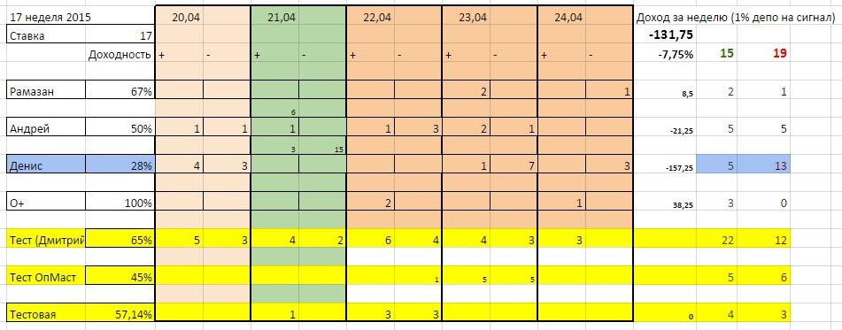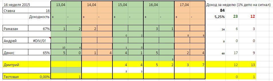 В тестирование добавлен новый сигналист Дмитрий, который демонстирровал скринами результативность в 75%, но по факту пока видим 12-13. По результатам следующей недели участники торгов решат стоит ли работать с ним дальше.