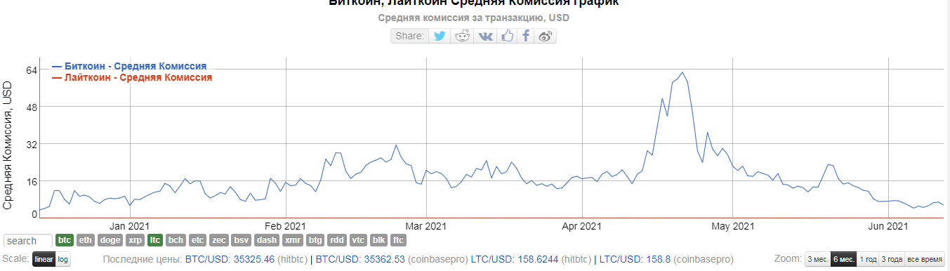 По данным BitinfoCharts, сейчас средняя комиссия в сети лайткоина составляет $0,021. На блокчейне BTC транзакционный сбор в середине июня снизился до $5,69.