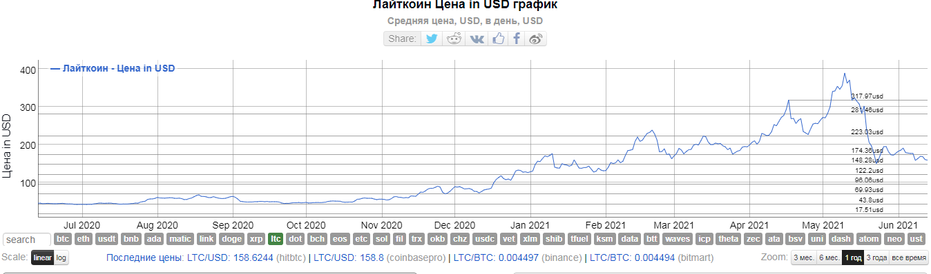 Курс LTC 13 июня вырос до $159,1 (+1,14%). Капитализация криптовалюты сейчас составляет чуть более $10,59 млрд.