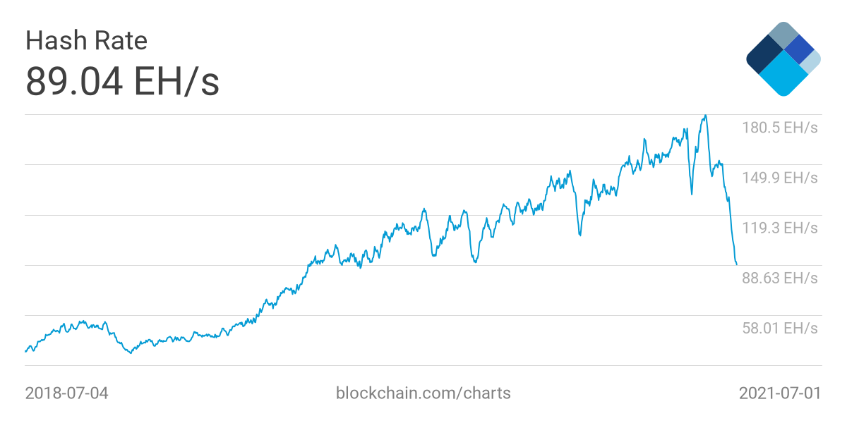 Хешрейт на этой неделе обвалился ниже 90 экзахеш в секунду (EH/s). Последний раз на таком уровне данный показатель находился в декабре 2019 года.