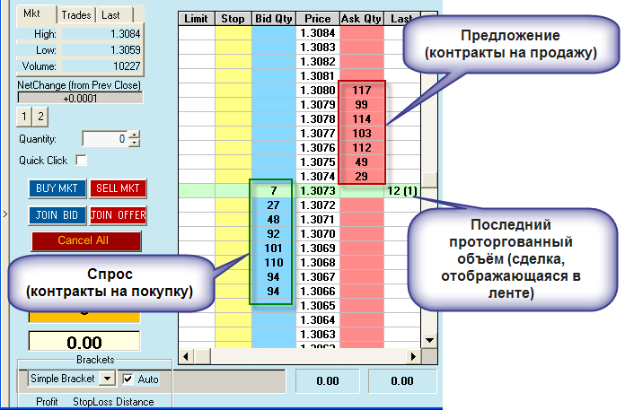Предложение в стакане называется асками — это цена, по которой продавец готов продать актив, а спрос называют бидами — это цена, которую готов заплатить покупатель финансового инструмента. Когда покупатель соглашается на цену продавца (как в примере на рис. 3), то происходит сделка по аску (в нашем случае произошла покупка по аску на ценовом уровне 1.3071). Если же продавец соглашается на цену покупателя, то происходит сделка по биду. Та сторона (покупатель или продавец), которая принимает цену противоположной стороны, является инициирующей сделку стороной. В нашем слечае на рис. 3 инициирующей стороной является покупатель, который согласился купить 2 контракта по цене 1.3071. Данная сделка отобразится в ленте и её производных как покупка двух контрактов по аску.