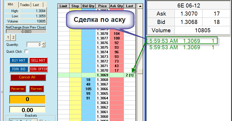 В данном случае по цене 1.3069 прошла последняя сделка по аску, которая отобразилась в стакане зелёным цветом, как инициативная покупка.