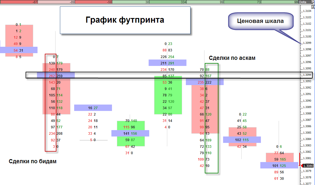 График футпринта (см. рис. 11, здесь и далее используется реверсивный график в 6 тик) таким образом отражает покупки по аску и продажи по биду, в данном примере покупки по аску отражаются справа внутри бара и окрашены в зелёный цвет, а продажи по биду находятся слева внутри бара и окрашены в красный цвет, вверху считается дельта. Дельтой является разница между объёмом, проторгованным по аску и объёмом, проторгованным по биду.