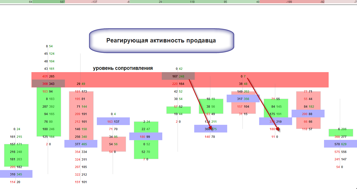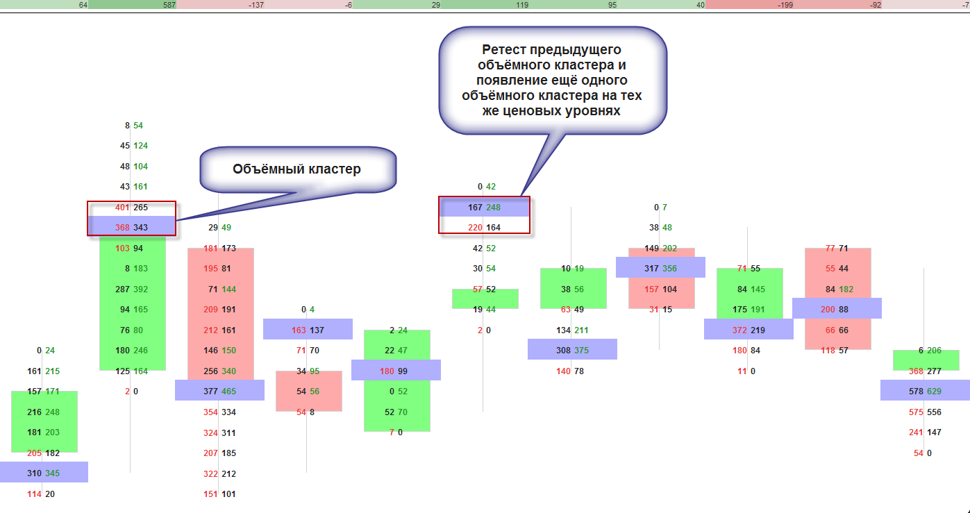 проторгованные рыночные ордера сталкиваются с преградой из лимитных ордеров, и тем самым, происходит накопление высокого и крайне-высокого объёма на соответствующих ценовых уровнях. Данные ценовые уровни визуально показывают появление реагирующей активности либо покупателей, либо продавцов.