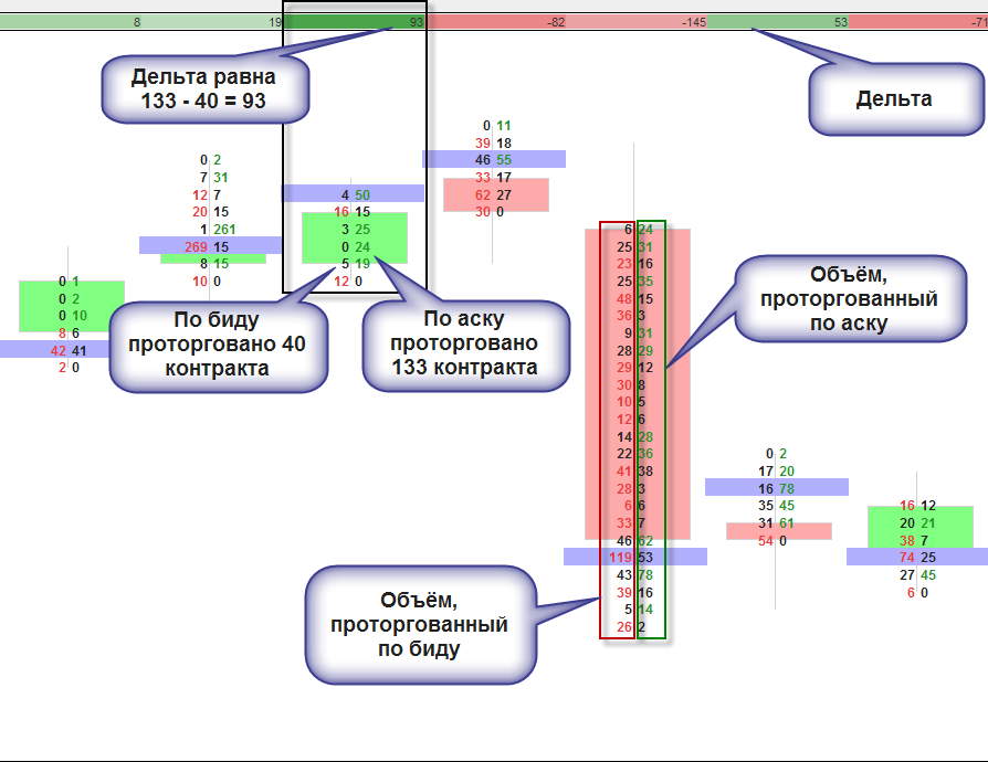 Например, если по биду проторговано 40 контрактов, а по аску проторговано 133 контракта, то дельта будет равна 93 контрактам (см. рис. 11). То есть, иными словами, дельта – это разница между ордерами, выполненными по цене аск и по цене бид. Она отображает текущее настроение участников рынка, которые покупают актив или продают его, используя рыночные ордера.