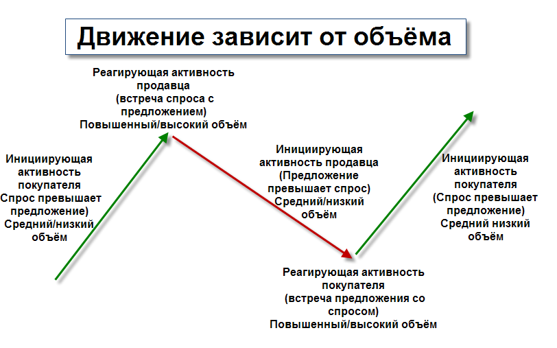 Часто на уровне встречи спроса с предложением будет возникать повышенный или высокий объём, который будет подтверждением того, что справедливая цена найдена и начинает осуществлятся двухсторонняя торговля. Как только произойдёт дисбаланс в спросе или предложении, то цена начнёт двигаться в каком-то определённом направлении в поисках следующей справедливой цены и так до бесконечности изо дня в день движется цена.