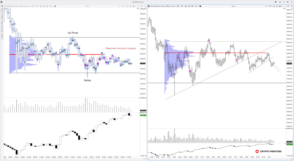 Мы так и не смогли преодолеть POC (point of control) глобального баланса. Несмотря на получение хорошей реакции с ложным пробоем от нижней границы $30 000, вот уже четвертую неделю не удается добраться до верхнего рубежа баланса — отметки $41 000.