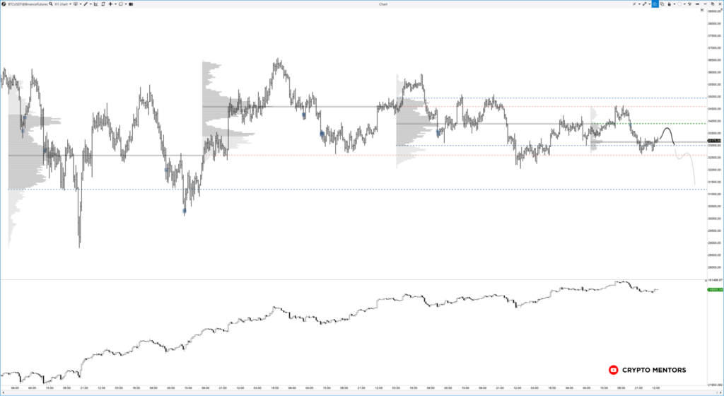 Более локально мы уже спозиционировали Value Area прошлой недели в продажи, то есть, закрепились ниже ее. Сейчас единственной поддержкой является диапазон $32 600-$32 860, который пока что также не демонстрирует силу покупателей.