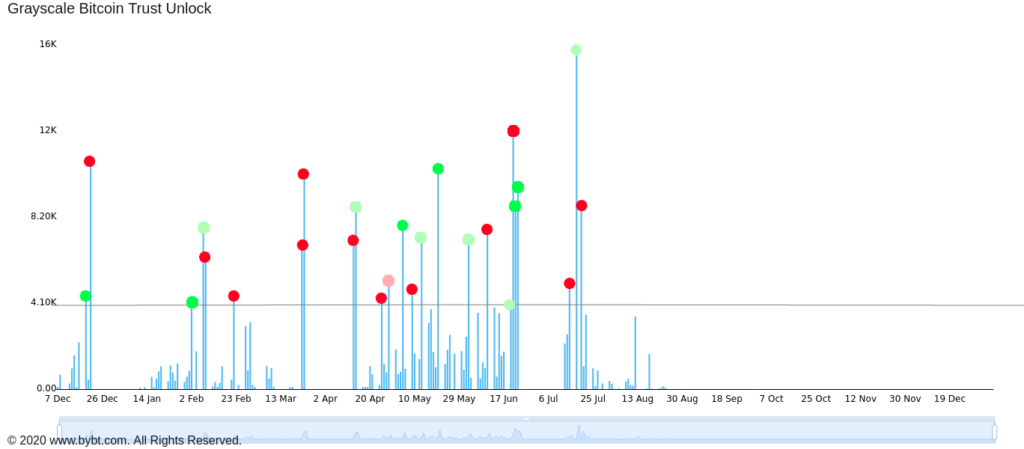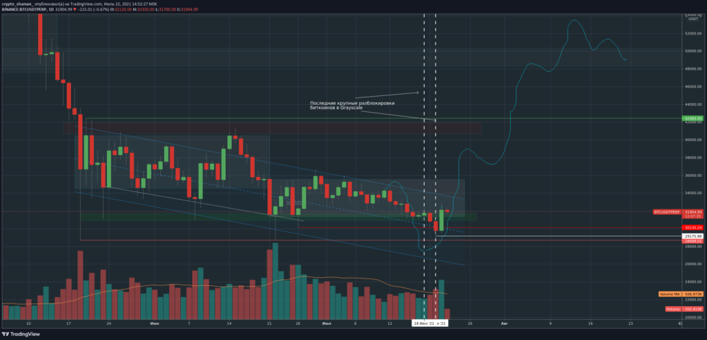 На данный момент все крупные разблокировки выполнены. Это говорит о том, что статистически выявленное давление на биткоин со стороны акций Grayscale временно приостановилось. Более подробный разбор влияния разблокировок акций Grayscale читайте в статье.