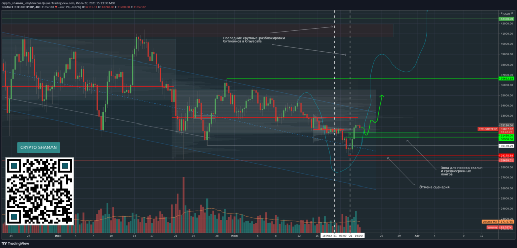 Среднесрочные покупки стоит рассматривать, расставляя ордера сеткой в указанной зеленой зоне. Точкой перелома (отменой сценария) является касание значения $29 175. На данный момент приоритет движения — только вверх.