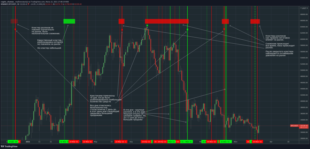 - После крупных разблокировок цена останавливала падение и отскакивала (или флет). Конец очередного кластера является своего рода экстремумом.