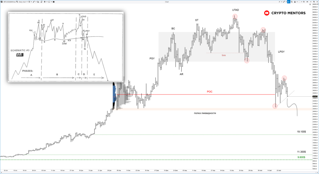 Наличие полки ликвидности ниже $30 000. Если цена окажется ниже этой зоны, лавина стопов спровоцирует дальнейшее импульсное движение вплоть до $19 600, первого серьезного уровня покупок. Эта же отметка выступает своего рода «магнитом» для цены, поскольку любой актив стремится к зоне повышенной ликвидности.