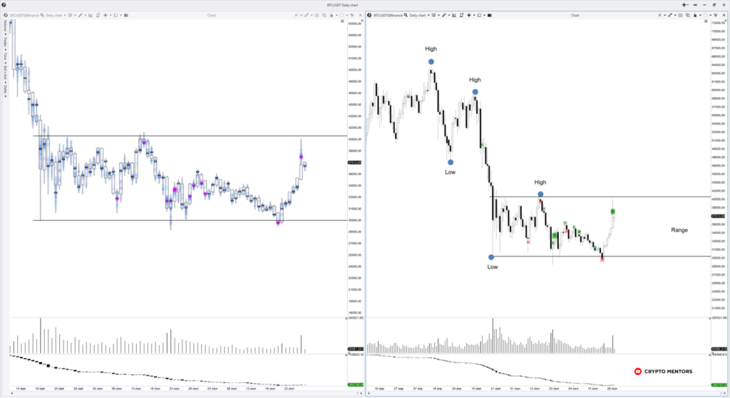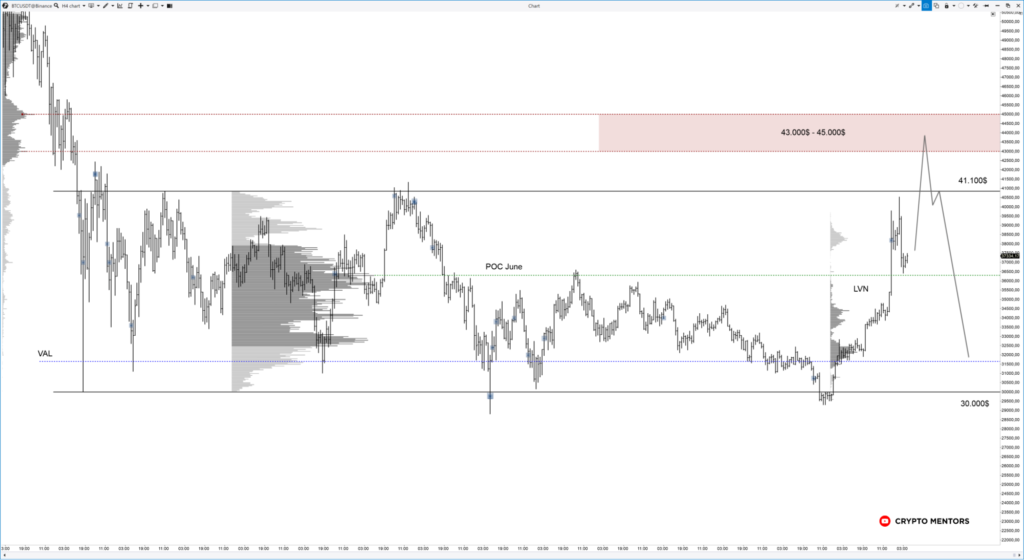 • если же удастся закрепиться выше $41 400 и появятся признаки истинного пробоя в виде упорядоченного чередования экстремумов в восходящем направлении, а также перемещения VA по ходу движения, — можно считать данное накопление расторгованным в покупки. В таком случае первичные цели роста будут $50 000 и $56 200.