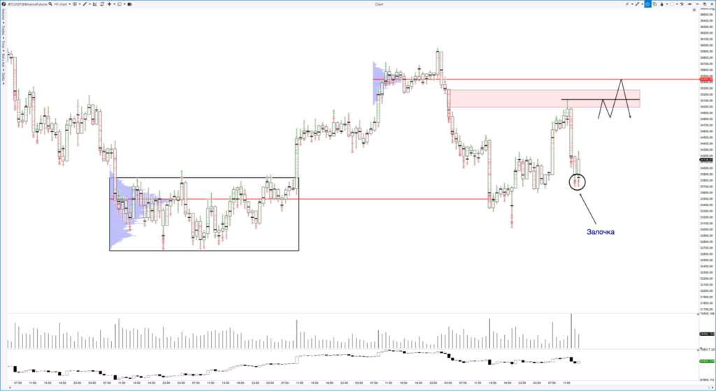 На часовом таймфрейме цена пришла к зоне интереса $33 600. При появлении инициативы покупателей можно будет рассматривать локальный лонг с максимальной целью на уровне $35 450. Там находится зона Low Volume Node и Point of Control проторговки.