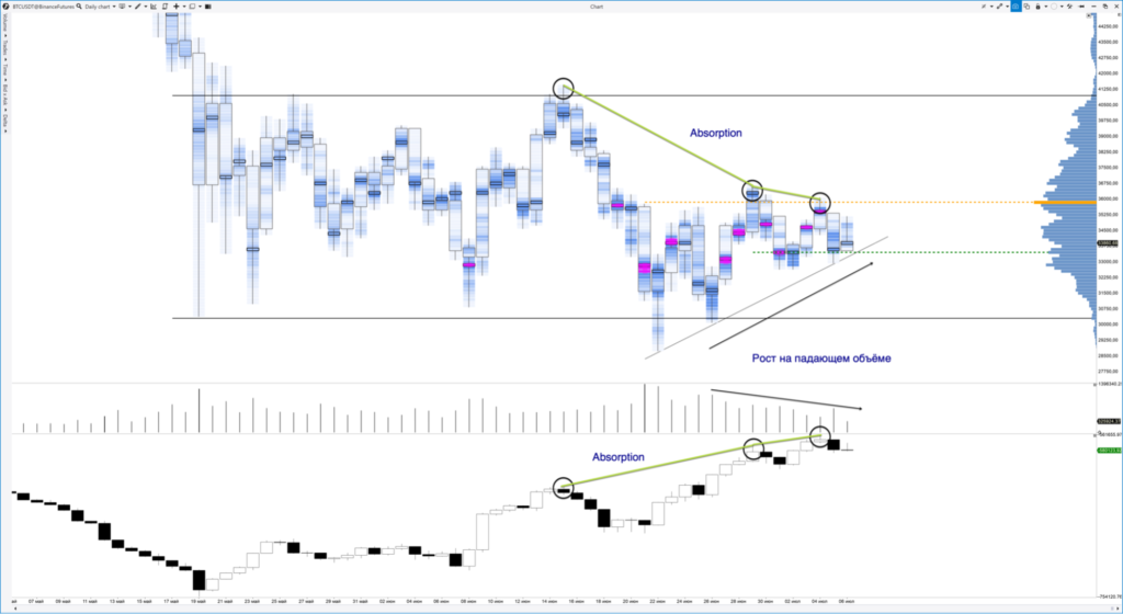 Эти факторы указывают на крайне низкую вероятность роста цены даже к $41 000, представляющей собой верхнюю границу флэта. С точки зрения объемного анализа сейчас далеко не самый удачный момент для покупки биткоина на среднесрочную перспективу, поскольку признаки спроса на рынке отсутствуют.