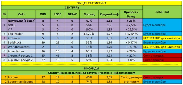1) На октябрь в продаже у нас остаётся 4 ресурса: Навин, Бетблог, Топинсайдер и Амар Сидран (ссылки в шапке темы). На данный момент эти ресурсы стабильны и свой выбор я остановил на них. Остальные снимаем с продажи. Протеннис и Ворлдбаскет - буду рассылать бесплатно людям, купившим подписку на любой ресурс. По желанию клиента конечно.