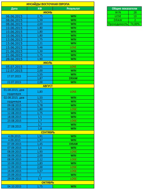 После знакомства с Володей (автором данной ветки) честно говоря, все сомнения быстро отпали. Человек порядочный, честный, ответственный. По результатам проверено лично, подтверждаю, что никакой рисовки ни здесь, ни в группе Вконтакте, - НЕТ! Вся информация которая тут представлена о прошедших ставках полностью соответствует действительности и статистика заявленная в таблицах по проходимости инсайдов за последние полтора месяца работы - именно такая и выходит у меня в итогах, все честно, - считаю это самый важный фактор доверия к сигналисту.