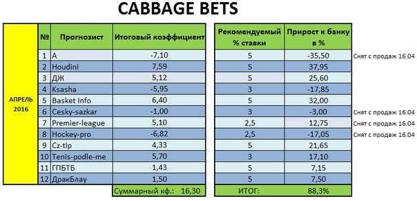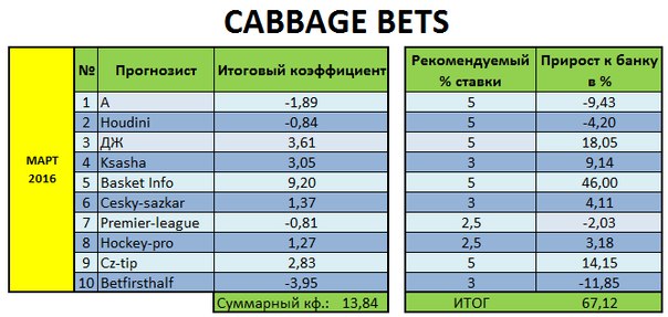 В итоге за март мы получили 69% прироста к банку. Всю малину нам подосрал Бетфёрстхалф, ресурс под номером 10. Который начал исполнять полную херню и давать на удачу, он удалён с позором из нашего списка прогнозистов. Но многие во время тормознули с ним и не ставили, это радует.