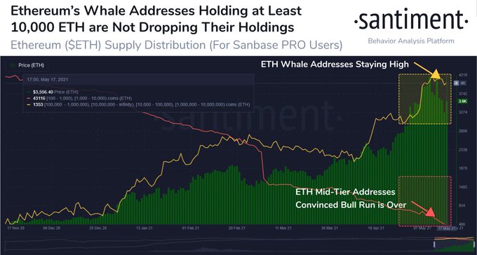 Эфир сегодня торгуется в районе $3320 (-2,69%). По данным команды Santiment, в результате падения стоимости крупнейшего альткоина число адресов, содержащих от 100 до 10 000 ETH, упало до трехлетнего минимума.