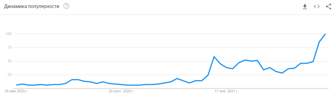 Два примерно одинаковых всплеска числа поисковых запросов, связанных с альткоином и сетью эфириума, сервис Google Trends зафиксировал в январе и феврале. Однако самая высокая активность пользователей Всемирной паутины наблюдается сейчас на фоне очередного обострения волатильности на крипторынке.