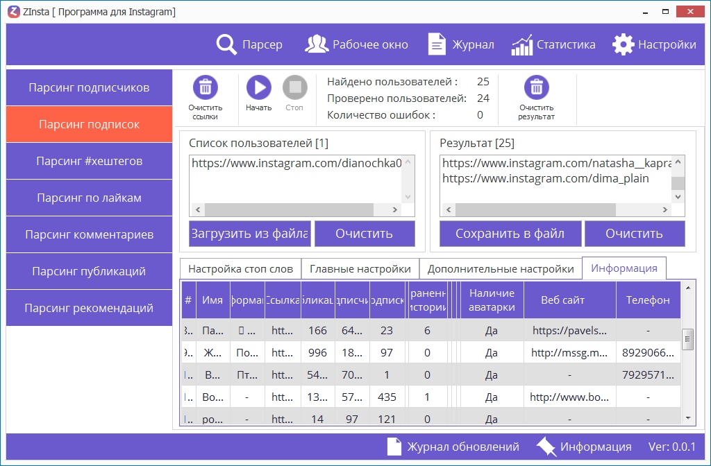 Парсинг подписчиков с критериями как наличие аватара, стоп слов, диапазонподписчиков/публикаций/подписок.